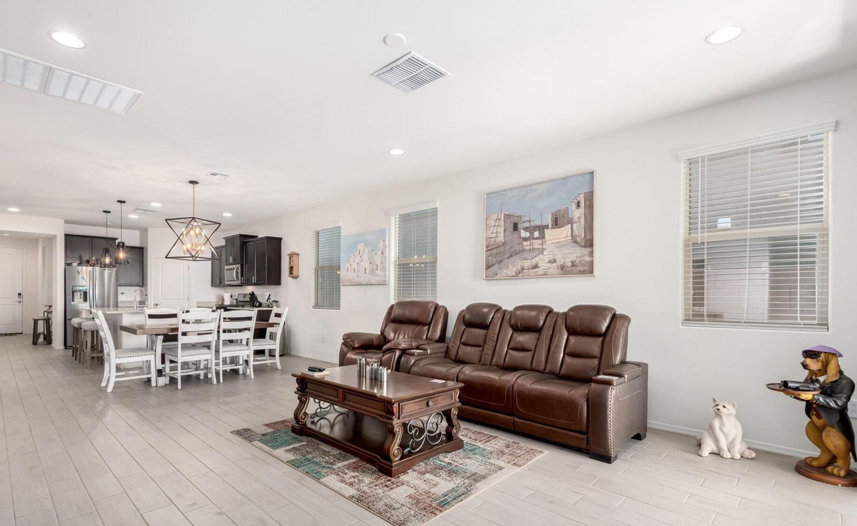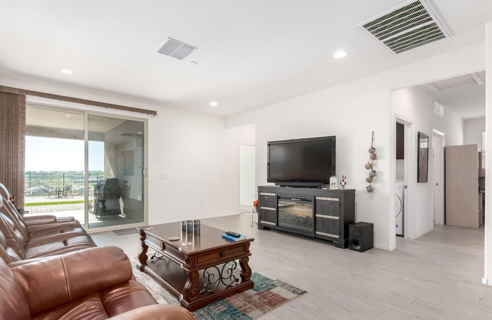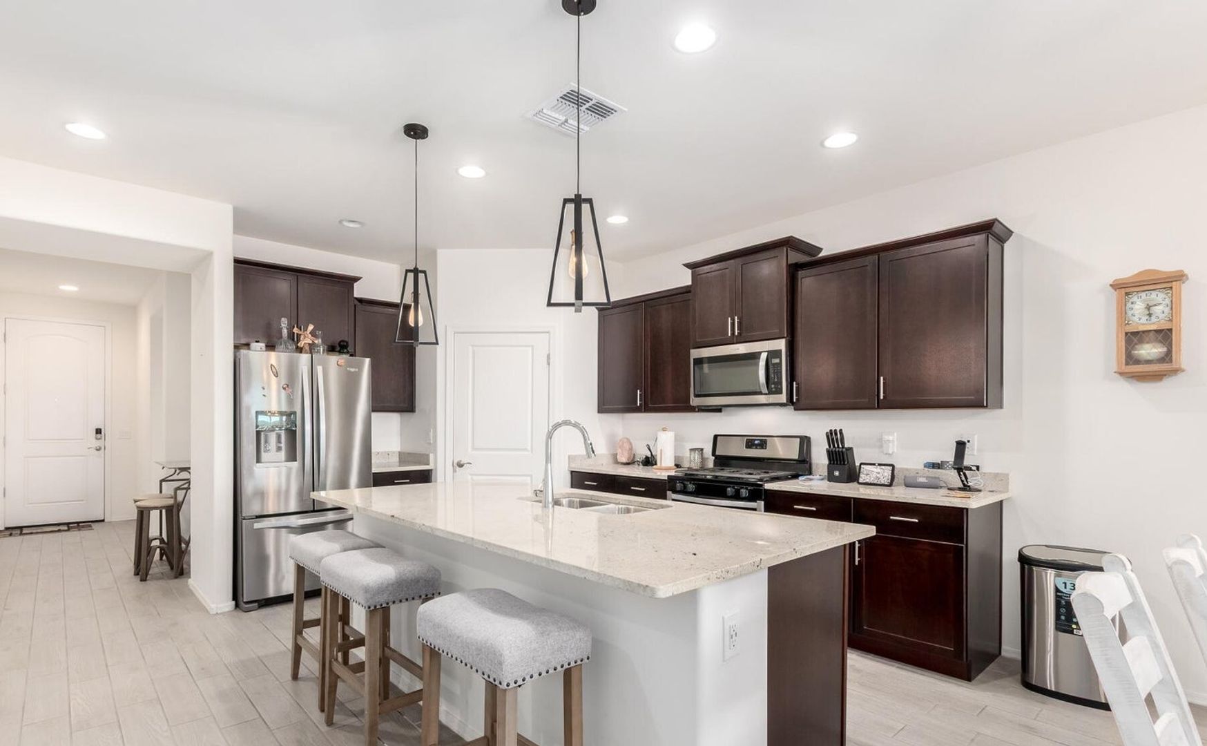 Located in Vail, AZ, this like-new (three years) home offers a thoughtful split-bedroom floorplan with four bedrooms plus a den and three full baths, including an en-suite primary. The great room concept features high ceilings and opens to a gourmet kitchen with 48" upper cabinets, a large pantry, kitchen island with sink, dishwasher and breakfast bar. Enjoy maintenance-free rear yard with artificial turf area, great views and easy walking access to Rancho Del Lago Golf Course. Additional highlights include beautiful built-in garage cabinets and generous living spaces designed for comfort and functionality. Pet friendly.